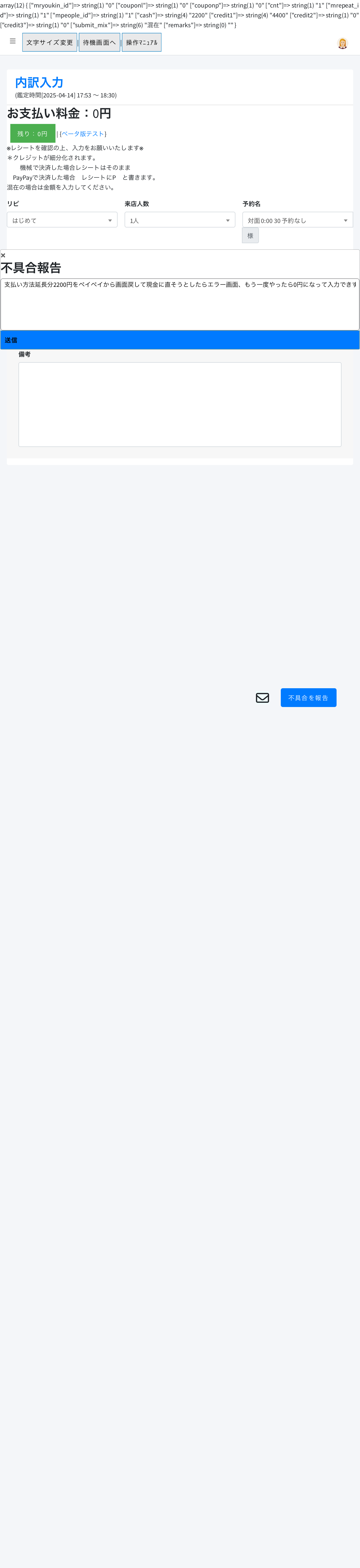エラー内容: 支払い方法延長分2200円をペイペイから画面戻して現金に直そうとしたらエラー画面、もう一度やったら0円になって入力できず正はクレ4400現金2200合計6600です