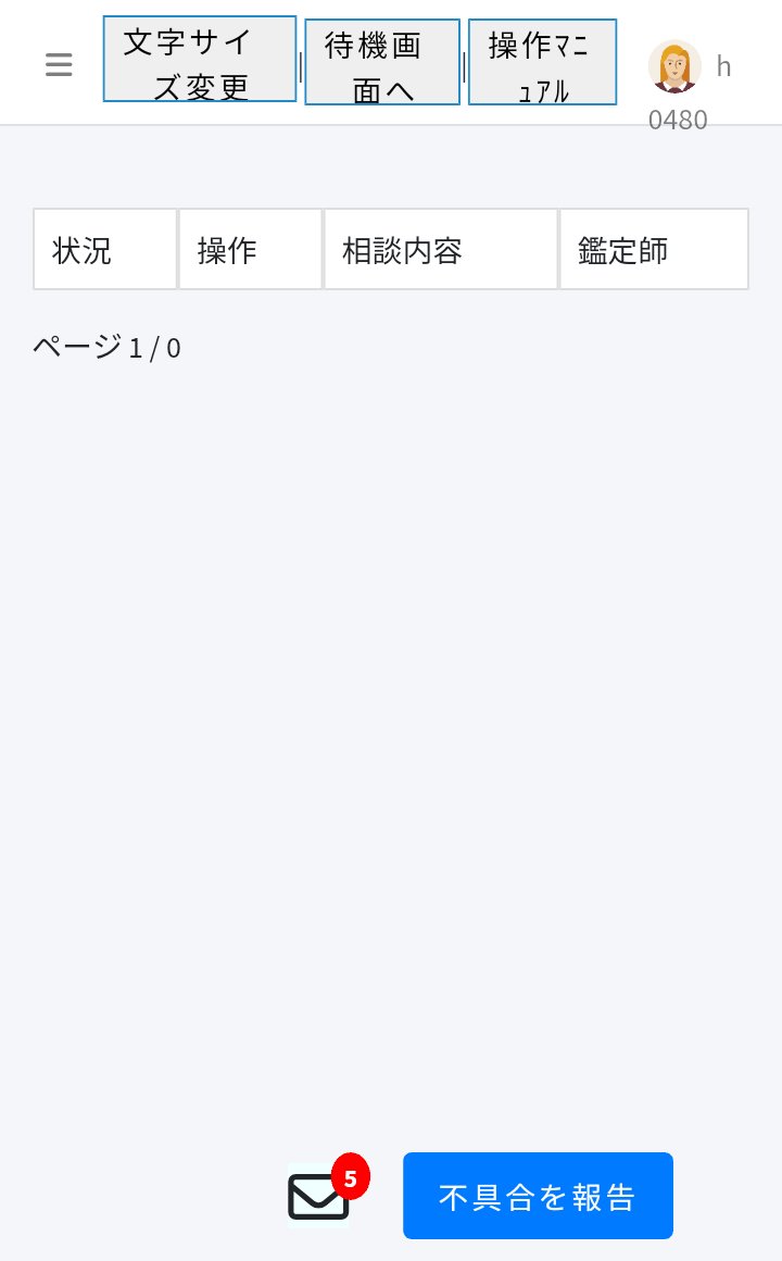 エラー内容: 状況 操作 相談内容 鑑定師 ページ 1 / 0 の表示はありますが、 質問内容も白ページのままで何もでてきません。 書き込みももちろんできません。