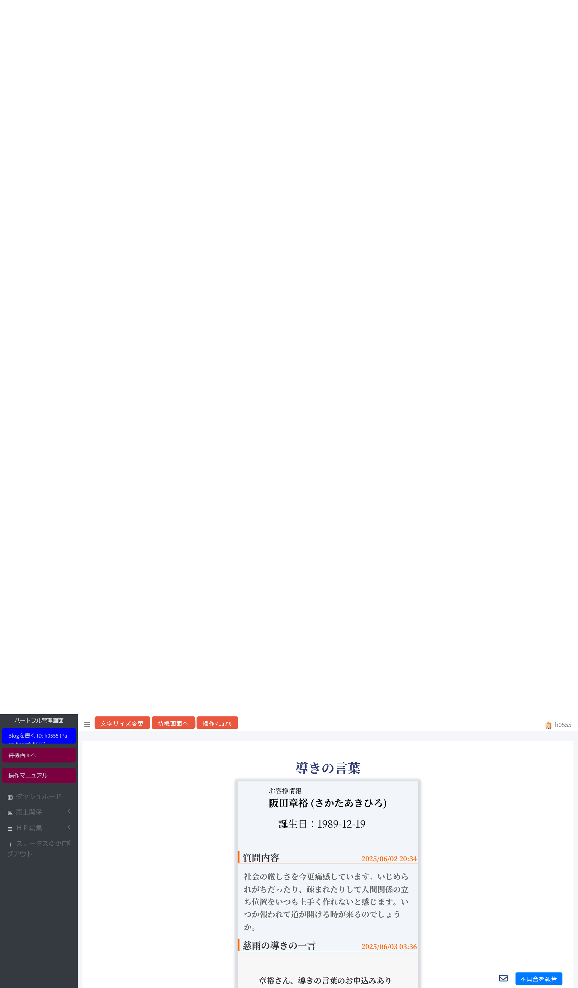 エラー内容: 導きの言葉で鑑定内容を送信しました。送信は完了したように見えますが、その後ハートフルのメニュー画面では「未鑑定」と表示されています(本来は「鑑定の修正」という表示になるはずです)。 https://sysf.heartful.work/michibikis/ ご確認の程よろしくお願いいたします。