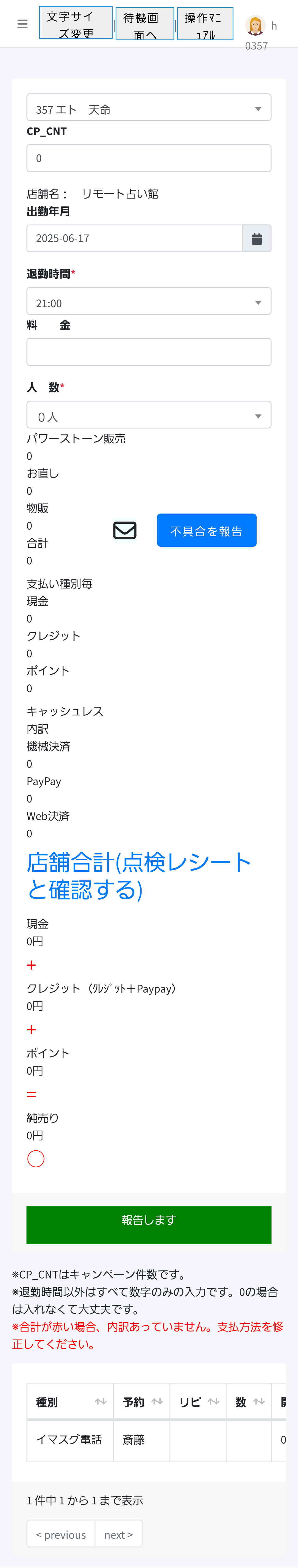 エラー内容: 6月16日~17日にかけてのリモートで鑑定終了時にエラーになり、そのまま売上げが消えてしまった。